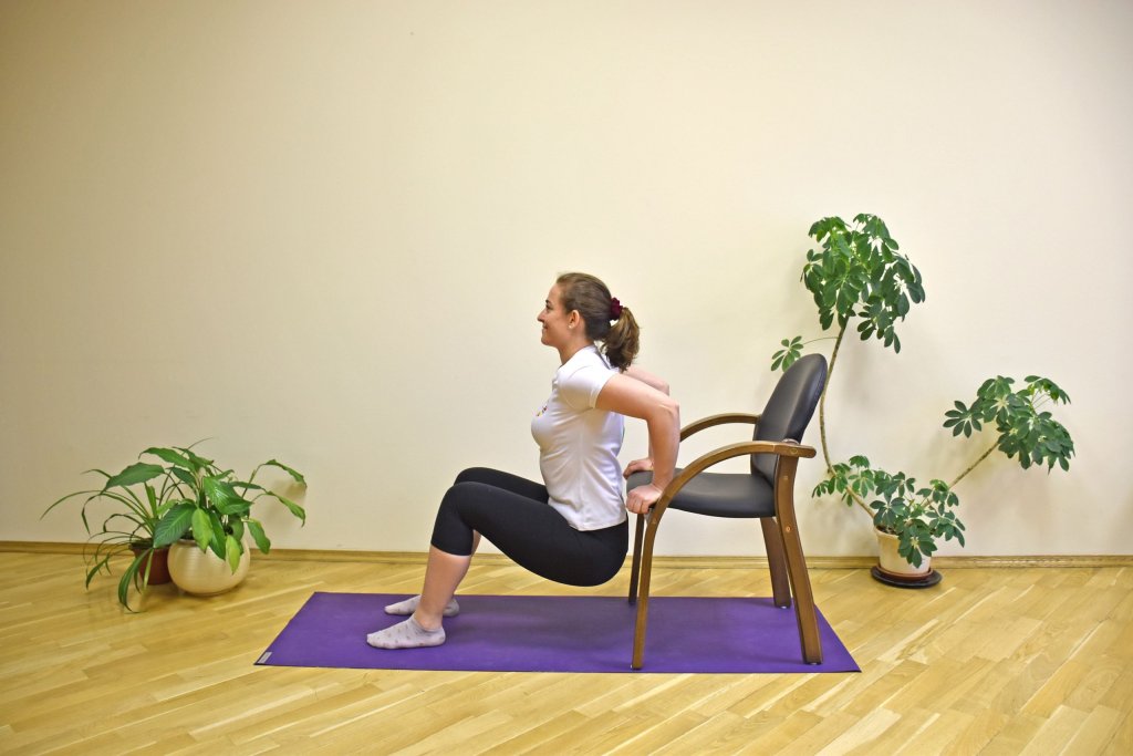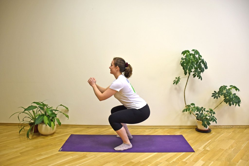 Coloque os pés na distância dos quadris, com os dedões apontado ligeiramente para fora. Então dobre os joelhos, mantendo o calcanhar no chão. Os joelhos devem ficar na altura dos pés, mas não ultrapassá-los (é o bumbum que deve ser jogado para trás). Agache de 10 a 15 vezes, descanse de 30 a 60 segundos, e repita até 5 vezes.