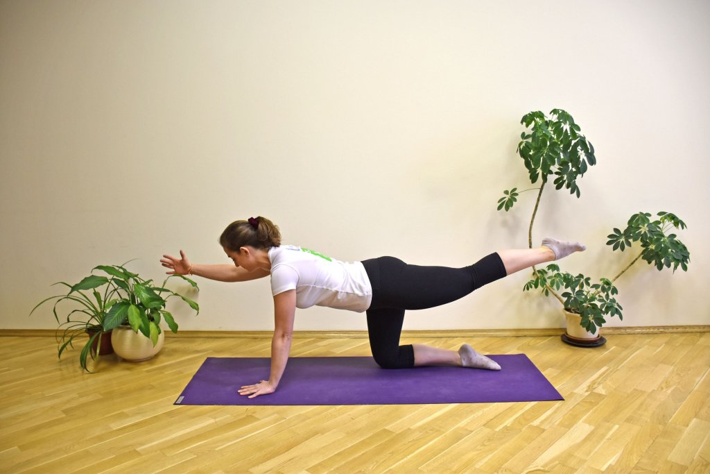 Coloque suas mãos embaixo dos ombros e os joelhos abaixo dos quadirs. Levanta um braço e a perna oposta, alternando entre os lados. Faça esse gesto de 20 a 30 vezes, descanse por 30 a 60 segundos, e repita tudo até cinco vezes. O exercício fortalece abdômen, glúteos e músculos das costas.