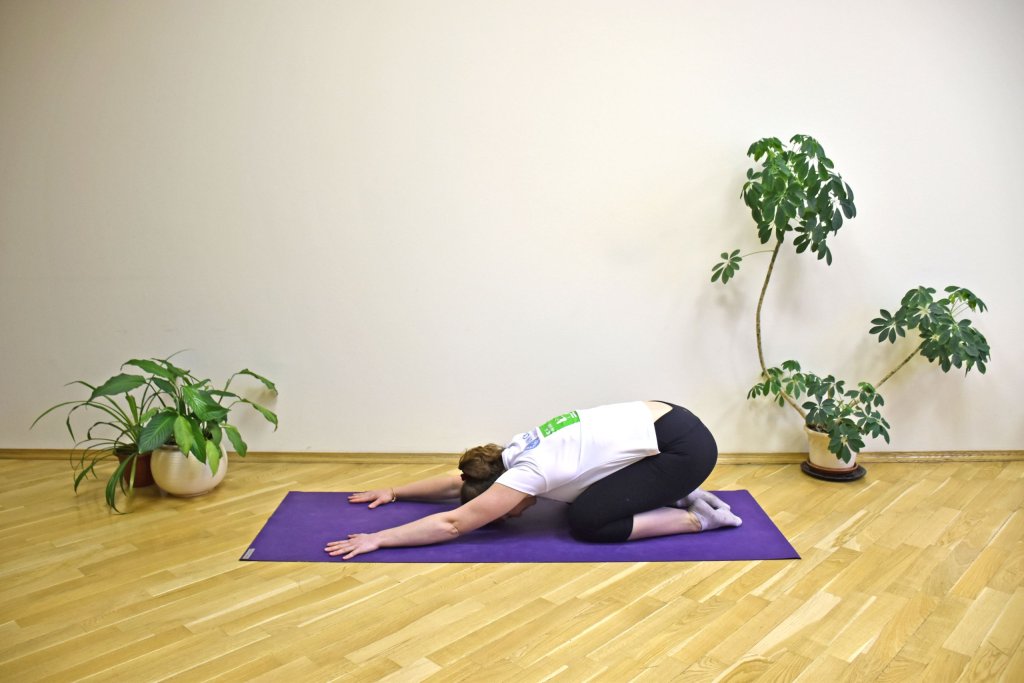 Com os joelhos no chão, leve o bumbum até os calcanhares. Deixe sua barriga apoiada nas coxas e estique ativamente os braços para frente. Respire normalmente. Mantenha essa posição de 20 a 30 segundos. Essa posição alonga suas costas, ombros e laterais do corpo.
