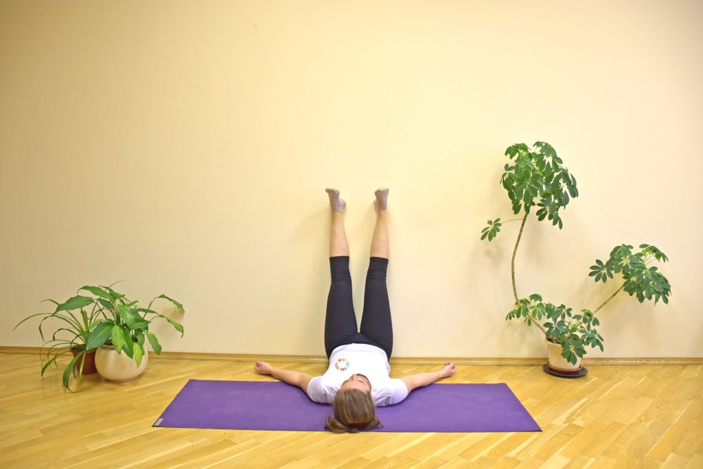 Leve seus quadris para perto da parede (de 5 a 10 centímetros), estique as pernas e deixe-as descansarem na parede. Feche os olhos, relaxa o corpo e respire lentamente. Concentre-se na respiração e não fique focado em um único pensamento ou preocupação. Mantenha-se assim por 5 minutos. Essa posição serve para relaxar.