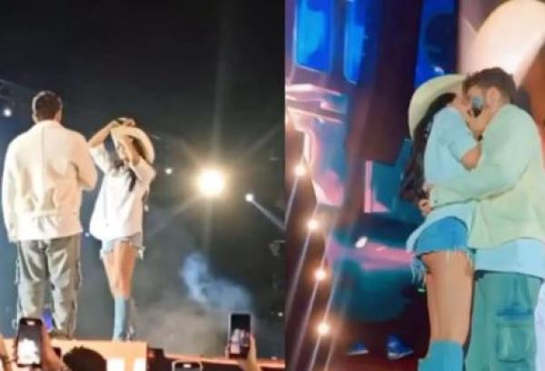 Ana Castela beija Mioto em palco de show e aconselha plateia: ‘voltem pro ex de vocês que é bom demais’