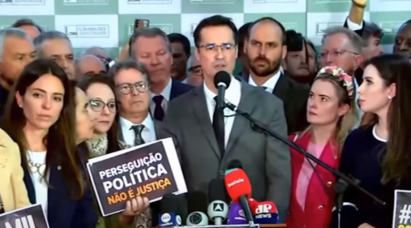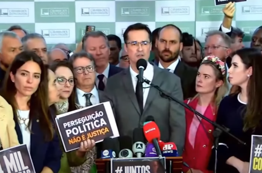 No Salão Verde, Dallagnol foi ladeado por diversos deputados bolsonaristas, como Eduardo Bolsonaro (PL-SP), Bia Kicis (PL-DF) e Rosângela Moro (União-SP), além da senadora Damares Alves (Republicanos-DF).