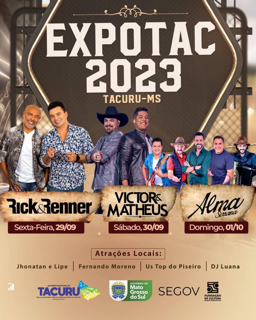 A abertura da Expotac será no dia 29 de setembro, sexta-feira, com a apresentação da dupla Rick & Renner, conhecida nacionalmente por músicas que atravessaram gerações.
