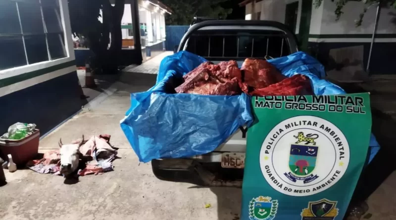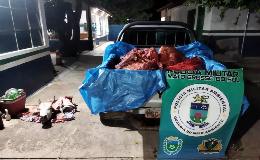 Policiais Militares Ambientais de Coxim, a 253 quilômetros de Campo Grande, prenderam cinco homens por furo e receptação de gado na noite deste sábado (16). Na ação, um veículo e um gato abatido também foram apreendidos.