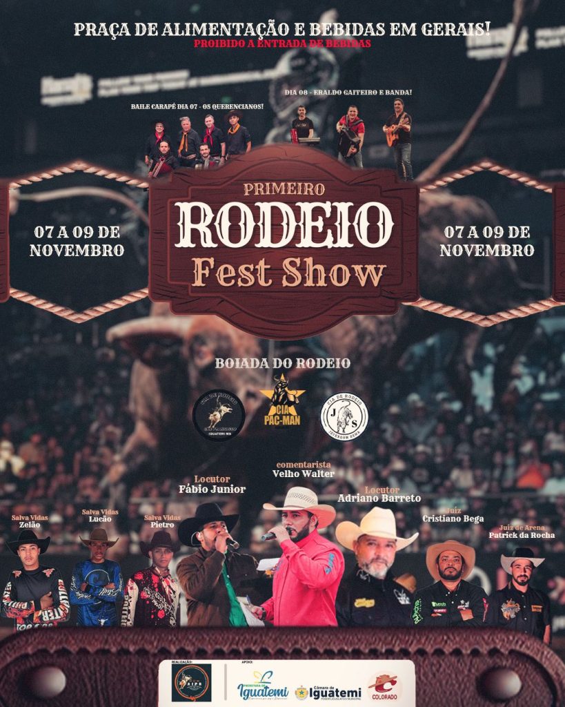 Nos dias 7, 8 e 9 de novembro, próximo final de semana, o Assentamento Colorado será sede do 1º Rodeio Fest Show, sob a organização da Associação Iguatemiense de Profissionais de Rodeio- AIPR, que tem em sua presidência Josimar Camilo. O evento, conta com apoio da Prefeitura de Iguatemi por meio da administração do Prefeito Lídio Ledesma e da Câmara de Vereadores.