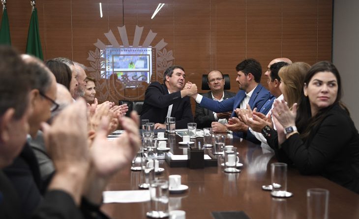 O governador Eduardo Riedel recebeu o prefeito de Itaquiraí, Thalles Tomazelli, para definir os projetos contemplados pelo programa, em uma reunião de trabalho realizada na tarde desta sexta-feira (11), que reuniu ainda vereadores, representantes da bancada estadual e federal.